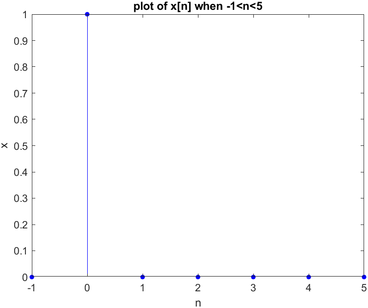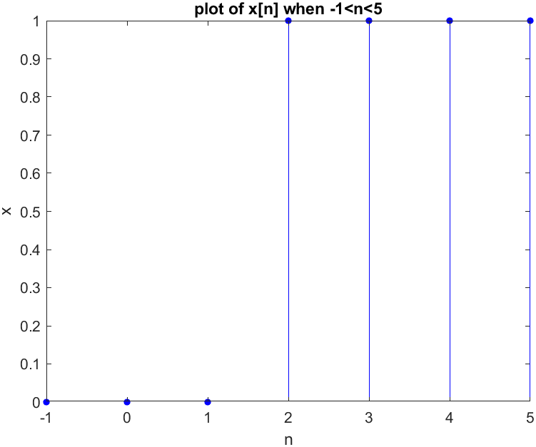 xlabel("n"); ylabel("x"); title('plot of x[n] when -1<n<5');Result