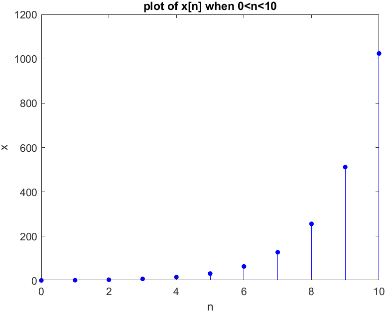 xlabel("n"); ylabel("x"); title('plot of x[n] when 0<n<10');Result